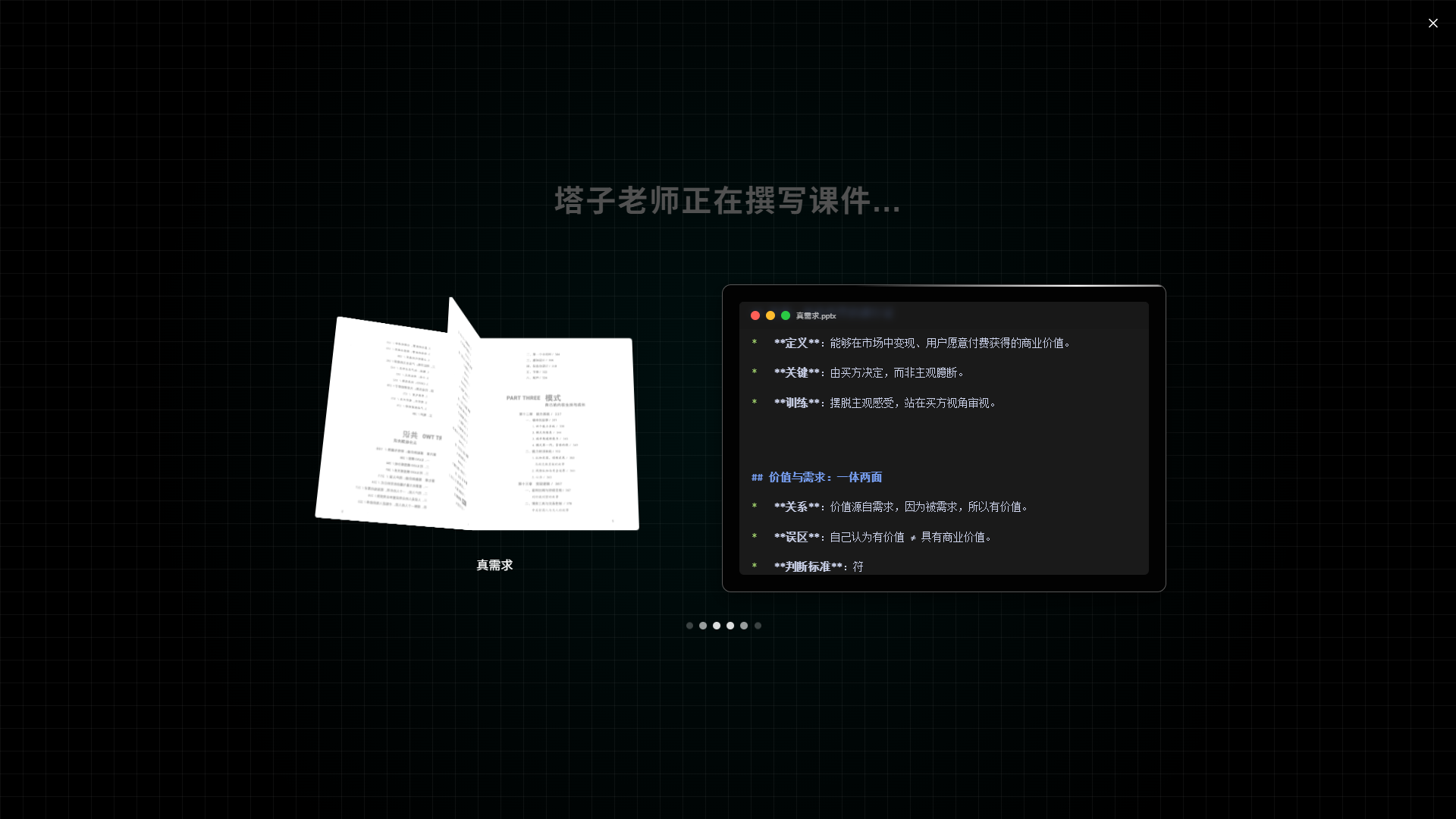 经过一分钟的等待后,一个课程就做好了。包含一套详细的课程PPT + 对应讲解 + 可交互答疑(实时提问),针对一些原理讲解时还会出来SVG动画,还有符合风格的人设和声音。