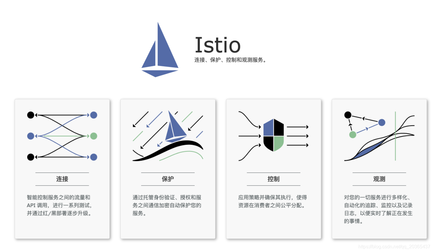 控制:Istio 通过可动态插拔、可扩展的策略实现访问控制、速率限制、配额管理、服务计费等能⼒。