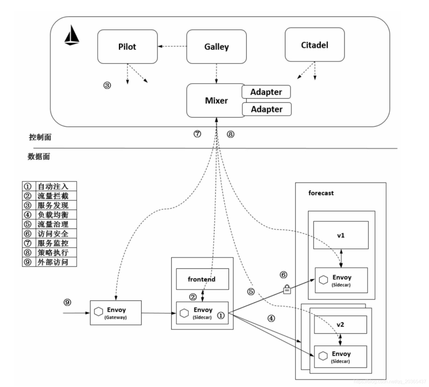 控制⾯主要包括Pilot、Mixer、Citadel等服务组件。