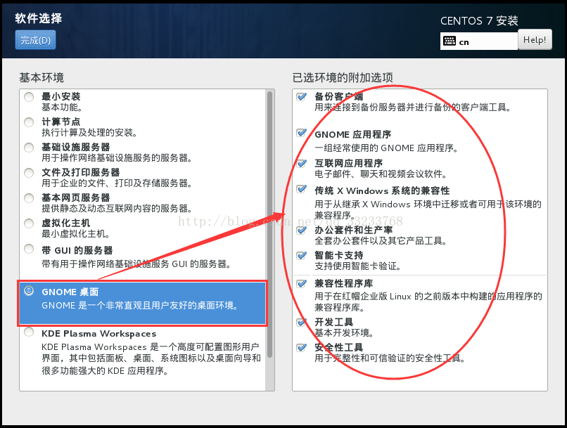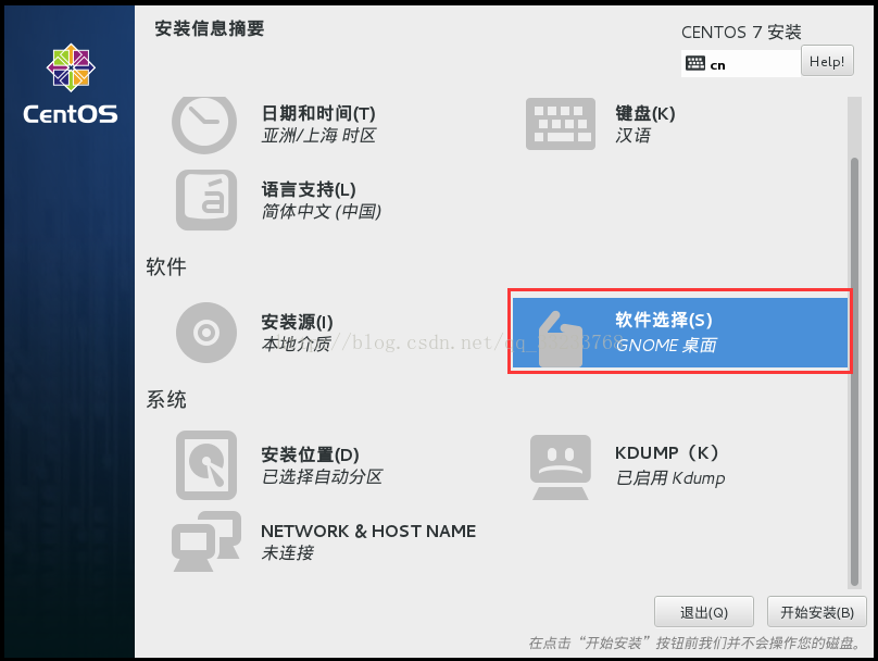 软件选择,这里和6系列是不同的,选择GNOME桌面,这就相当于Centos6安装时的Desktop,你可以按照自己的需要进行配置