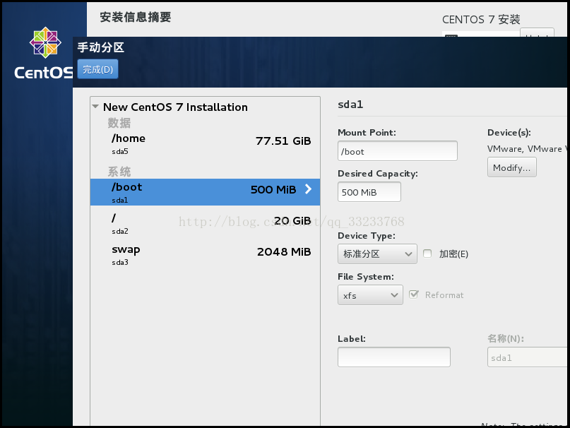 安装位置和系统分区,选择我要自己配置分区,点击Done,进入手动分区,根据自己的需要设置分区大小
