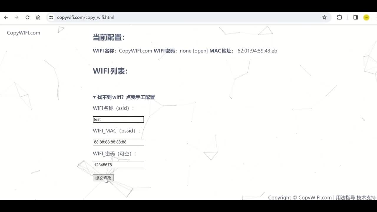 WIFI复制工具使用指导 一、 浏览器打开 https://copywifi.com 或 https://evilusb.com/copywifi/ 二、 将设备插入电脑 三、 点击网页界面的“连接设备” 四、 设备会自动搜索周围的wifi,从wifi列表中选取一条进行复制 五、 确认wifi名称、MAC地址,然后输入wifi密码 六、 等待约5秒钟,配置生效后会有弹窗提示 七、 拔插设备(断电再上电),此时目标wifi已被我们复制验证生效:通过WirelessMon.exe软件搜寻目的wifi,发现RSSI(信号强度)从-59