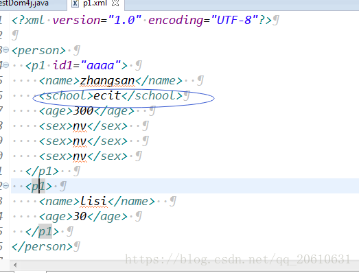 //在第一个p1下面的age标签之前添加 <school>ecit.edu.cn</schlool>