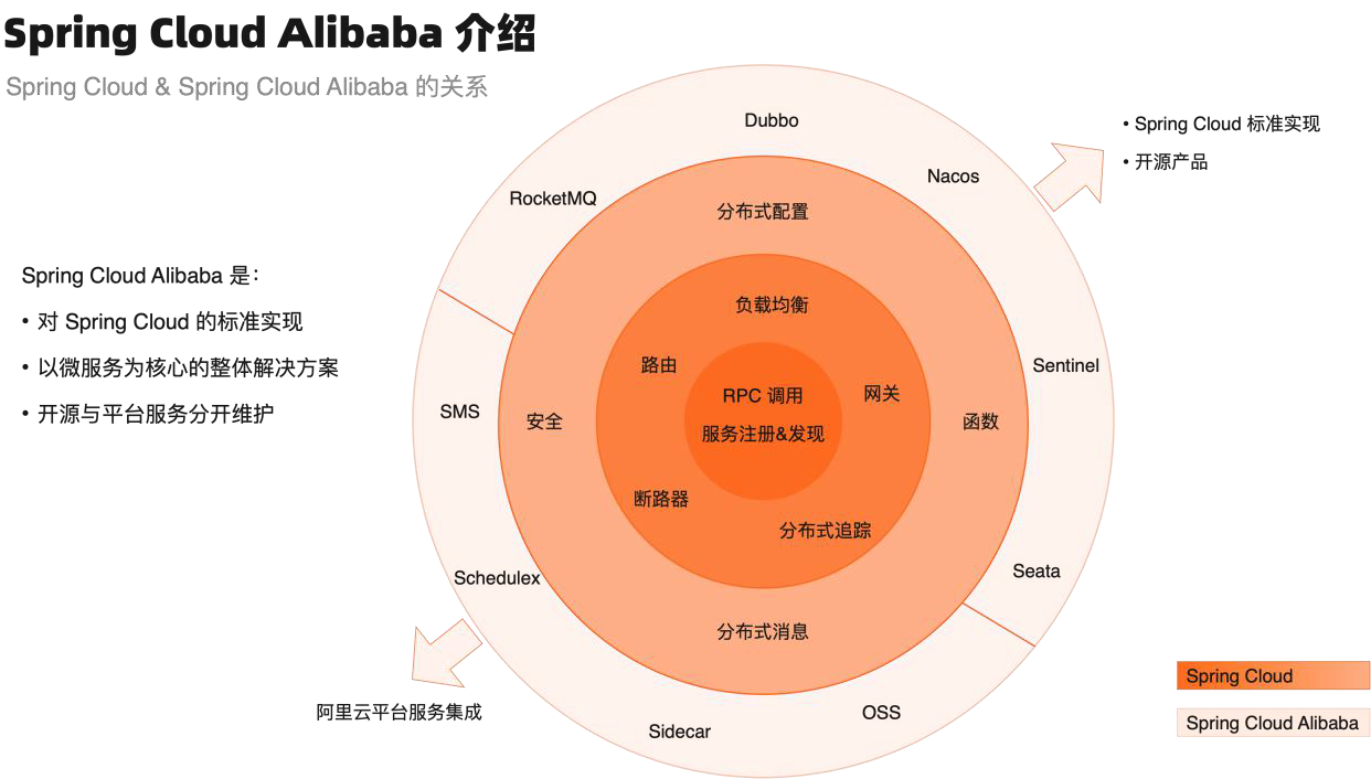 最外面这一圈,是 Spring Cloud Alibaba 对 Spring Cloud 的实现。