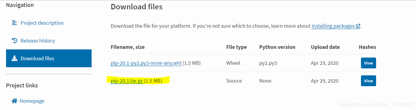 第一步,先去网站:https://pypi.org/project/pip/#files ,下载pip 安装包。