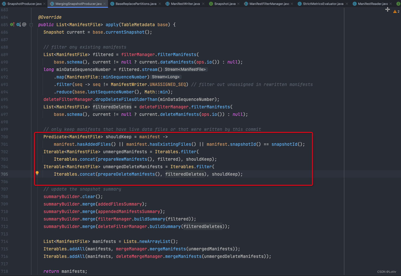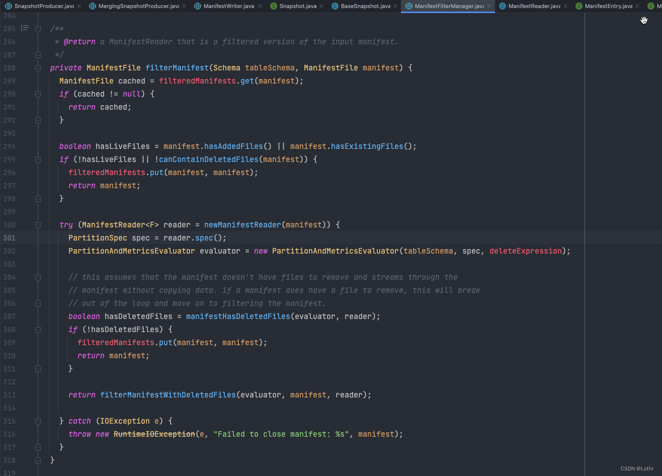 - 若Manifest中有DeletedFiles,则重写Manifest。重写规则为:若文件信息本身就是DELETED,则丢弃该文件信息;若文件信息在本次Snapshot中删除,则将文件信息置为DELETED;剩余的文件信息均置为EXISTING(具体可进filterManifestWithDeletedFiles自行阅读)