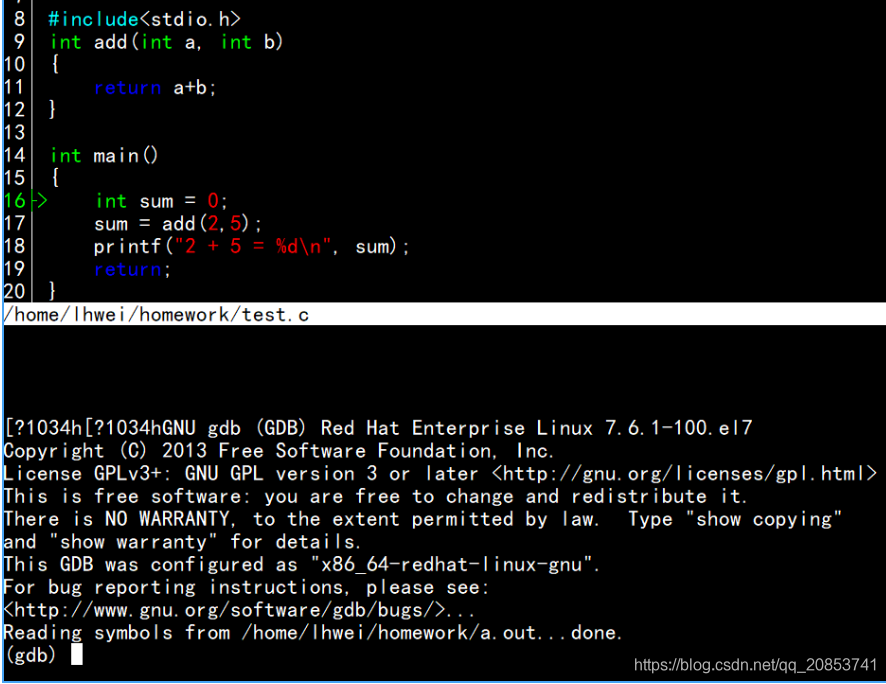 执行上面最后一条命令后进入cgdb界面: