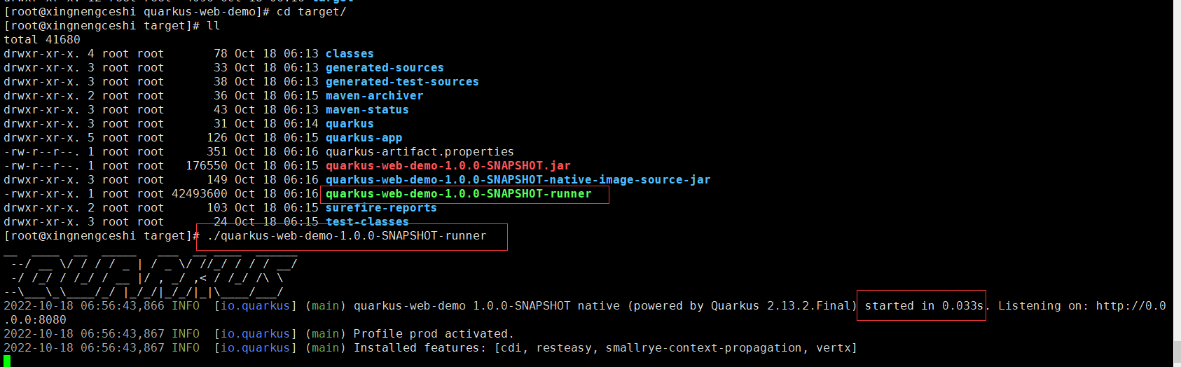 可以直接通过java -jar运行quarkus-app目录下quarkus-run.jar和quarkus-web-demo-1.0.0-SNAPSHOT-native-image-source-jar目录下的quarkus-web-demo-1.0.0-SNAPSHOT-runner.jar,不到1秒的时间就启动完毕了,访问上面测试地址同样可以看到正确的结果