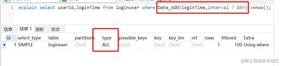 explain select userId,loginTime from loginuser where loginTime >= Date_ADD(NOW(),INTERVAL - 7 DAY);
