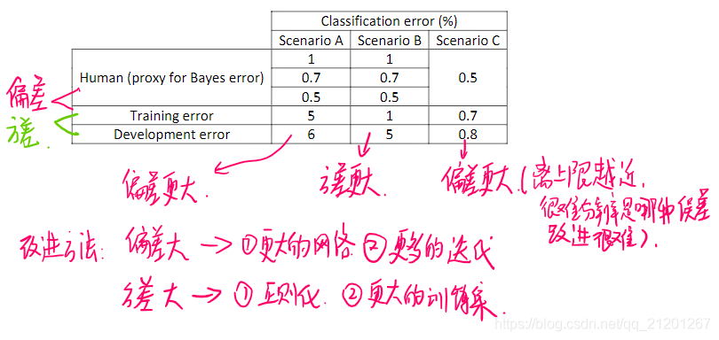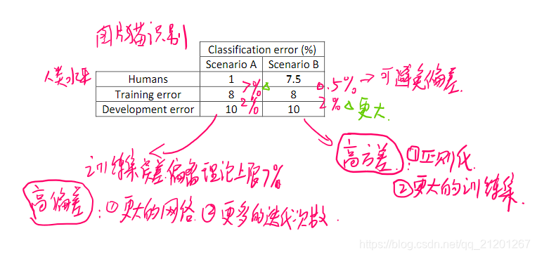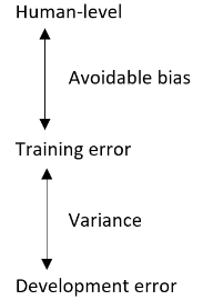 - 训练集误差 与 贝叶斯估计误差 之间的差距:可避免偏差