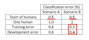情况B:超过 0.5% 的门槛(比最好的医生的误差还低),要进一步优化你的机器学习问题就没有明确的选项和前进的方向了