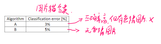 误差: \frac{1}{\sum w^{(i)}} \sum_{i=1}^{m_{d e v}} w^{(i)} \mathcal{L}\left\{\left(\hat{y}^{(i)} \neq y^{(i)}\right) \bigg\}\right.
