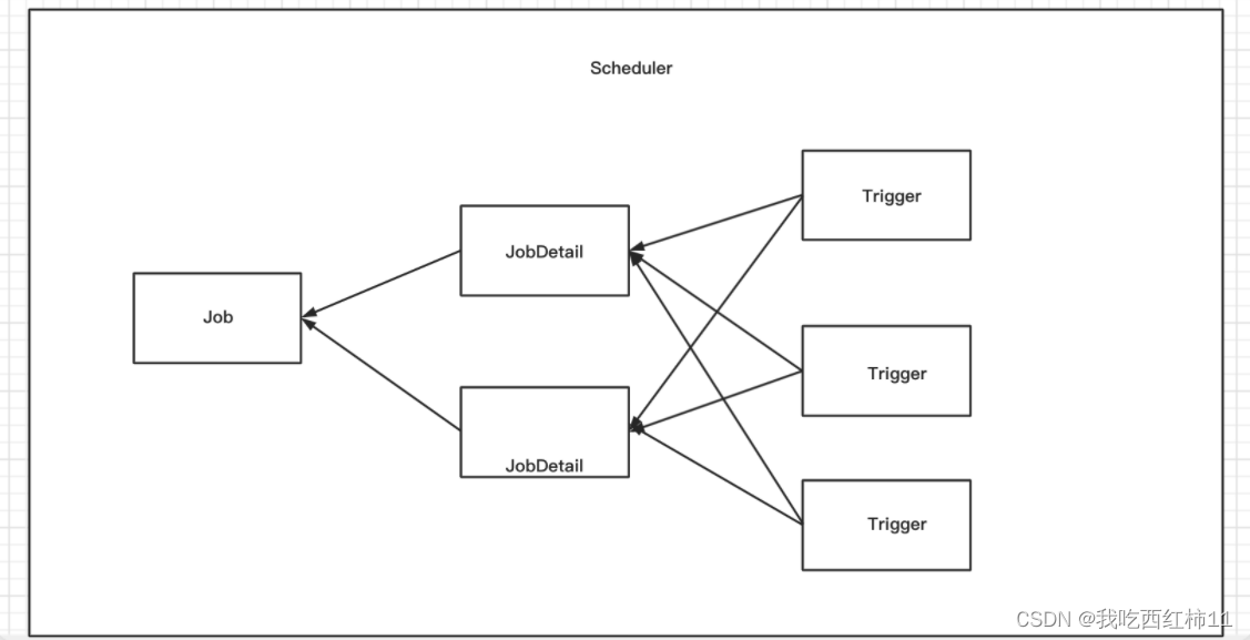 (3)Scheduler(调度器):代表一个Quartz的独立运行容器。Trigger和JobDetail可以注册到Scheduler中。Scheduler可以将Trigger绑定到某一JobDetail上,这样当Trigger被触发时,对应的Job就会执行。一个Job可以对应多个Trigger,但一个Trigger只能对应一个Job。