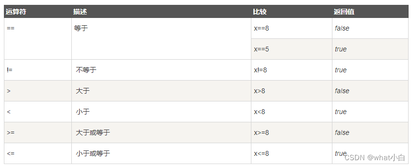 x=5,下面的表格解释了关系运算符的操作: