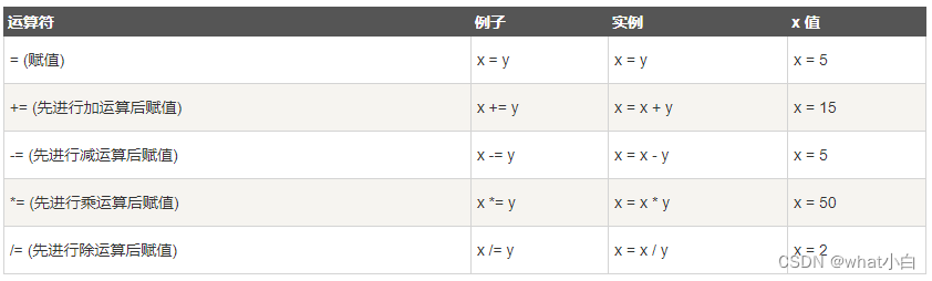 给定 x=10 和 y=5,下面的表格解释了赋值运算符: