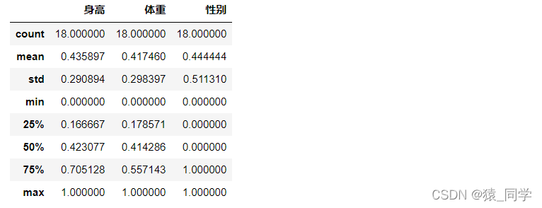 data['体重']=(data['体重']-data['体重'].min())/(data['体重'].max()-data['体重'].min())