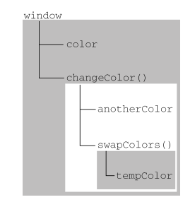 - 对于这个例子中的swapColors()而言,其作用域链中包含3 个变量对象:swapCo