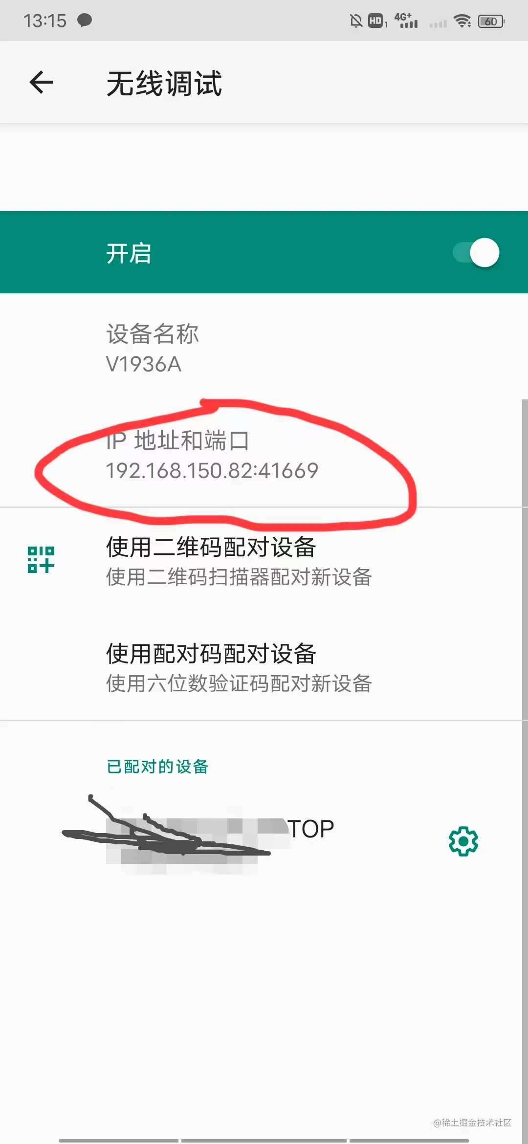 - 电脑和手机连在同一网络下,手机打开无线调试