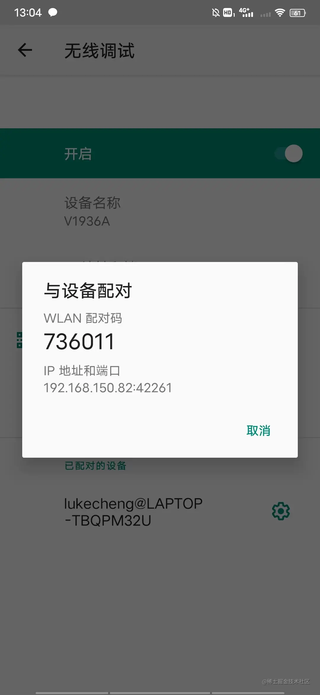在电脑命令行输入上图,也就是配对码弹出弹框里的 ip 地址和端口号。然后按提示输入配对码(736001)。