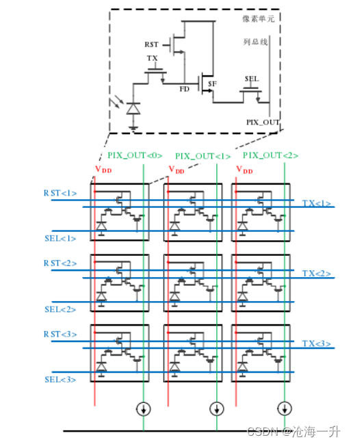 传统CMOS图像传感器的芯片架构中,像素的控制信号从水平方向驱动,像素的源极跟随器输出电压垂直地输出到位于顶部和底部的模拟前端读出电路,其具体实现方式如下图所示,其中RST, TX和SEL是像素水平控制信号,像素输出电压PIX OUT垂直地传输到读出电路。