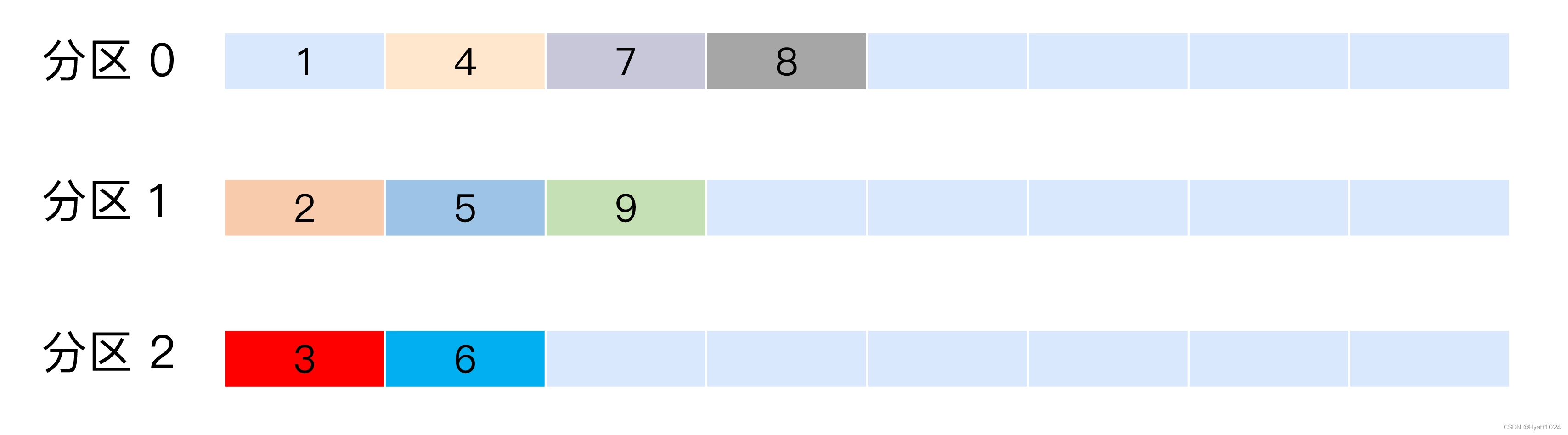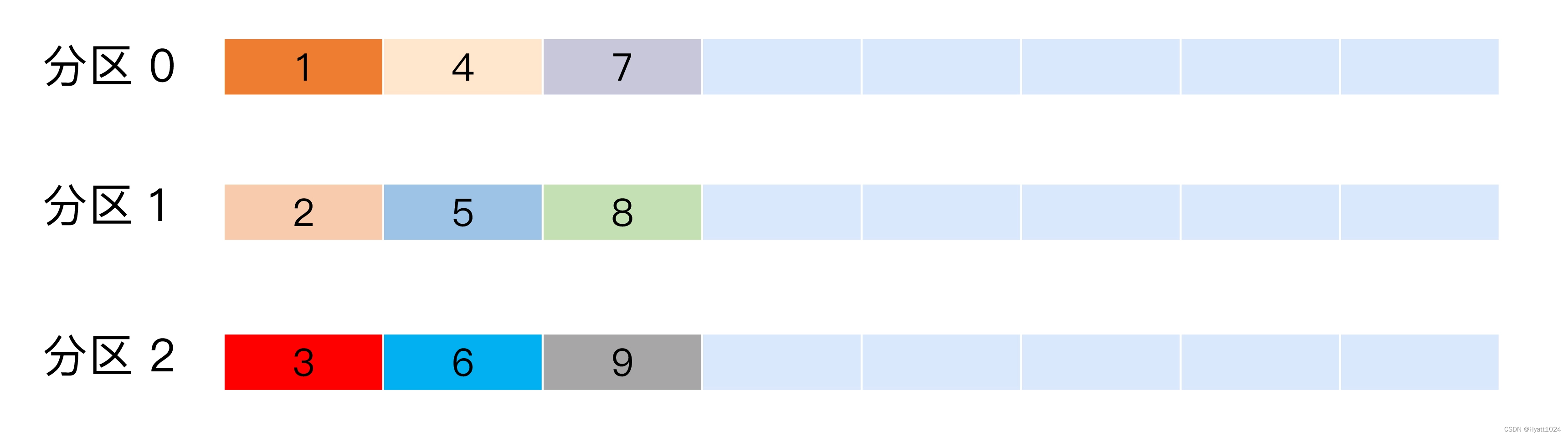 也称 Round-robin 策略,即顺序分配。比如一个主题下有 3 个分区,那么第一条消息被发送到分区 0,第二条被发送到分区 1,第三条被发送到分区 2,以此类推。当生产第 4 条消息时又会重新开始,即将其分配到分区 0,就像下面这张图展示的那样。
