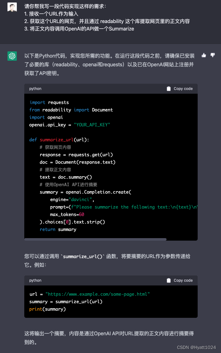 而且,ChatGPT 不仅可以解释概念,还能解释代码。你可以直接贴一段代码给到 ChatGPT,让它为你详细讲解,可以说是一个非常好的助教。而且这个助教知识广博、不知疲倦、极有耐心,绝对不会因为你有什么不懂的反复提问而表示不耐烦。