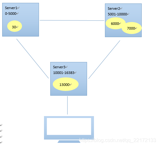 这也是redis cluster的数据分布算法,Redis 集群中内置了 16384 个哈希槽,当需要在 Redis 集群中放置一个 key-value 时,redis 先对 key 使用 crc16 算法算出一个结果,然后把结果对 16384 求余数,这样每个 key 都会对应一个编号在 0-16383 之间的哈希槽,redis 会根据节点数量大致均等的将哈希槽映射到不同的节点,示例如下: