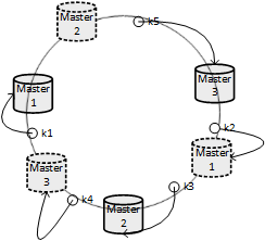 这样即使其中一个master宕机了,因为照着顺时针走,之前的master找不到了,会走到下一个master去,当然也找不到数据,但是其中2/3是可以找到的。不过这里还存在缓存热点问题,即可能集中在某个hash区域的值特别多,那么会导致大量的数据都涌入同一个master内,造成master的热点问题,性能出现瓶颈。我们可以使用一致性hash算法虚拟节点来实现负载均衡,
