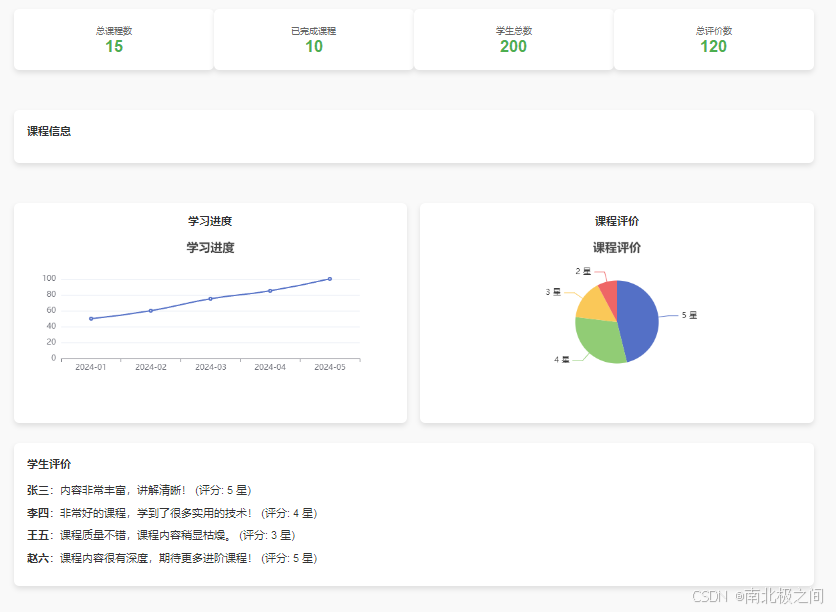 Vue 实现在线学习平台的课程管理页面:学习进度与课程评价图表展示》《Vue 2 构建在线教育平台:课程管理、学习进度和学生评价可视化》《前端实战:课程管理与学生进度追踪,使用 Vue 和 ECharts 展示数据》《Vue 项目实例:设计在线学习平台的课程管理与学生评价功能》《在线教育系统:构建课程管理页面,数据可视化与学生评价分析》Vue 实现在线学习平台的课程管理页面:学习进度与课程评价图表展示》《Vue 2 构建在线教育平台:课程管理、学习进度和学生评价可视化》《前端实战:课程管理与学生