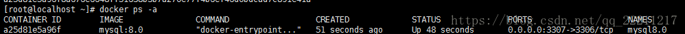 docker run --name mysql8.0 -p 3307:3306 -e MYSQL_ROOT_PASSWORD=root -d mysql:8.0