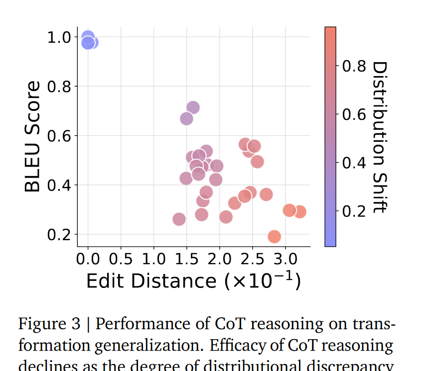 CoT依赖训练分布:仅在与训练数据分布一致或接近时有效,轻微偏离(如新变换、长度变化)就会导致性能骤降,暴露其“表面推理”本质;
