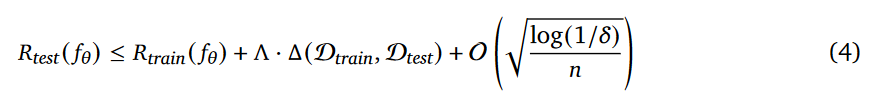 泛化界定理:把 “题像不像” 和 “做对率” 绑死(公式 4 的核心) “模型在测试题上的出错概率(测试风险),取决于三件事”: ① 训练时的出错概率(训练风险)—— 基础没学好,肯定用不好; ② 训练和测试的题的 “不像程度”(分布差异)—— 题越不一样,错得越多(“Λ” 是放大这个影响的系数,比如复杂任务对 “不像” 更敏感); ③ 训练样本量(n)—— 练得越多,对 “模板” 记得越牢,轻微 “不像” 时容错率稍高。