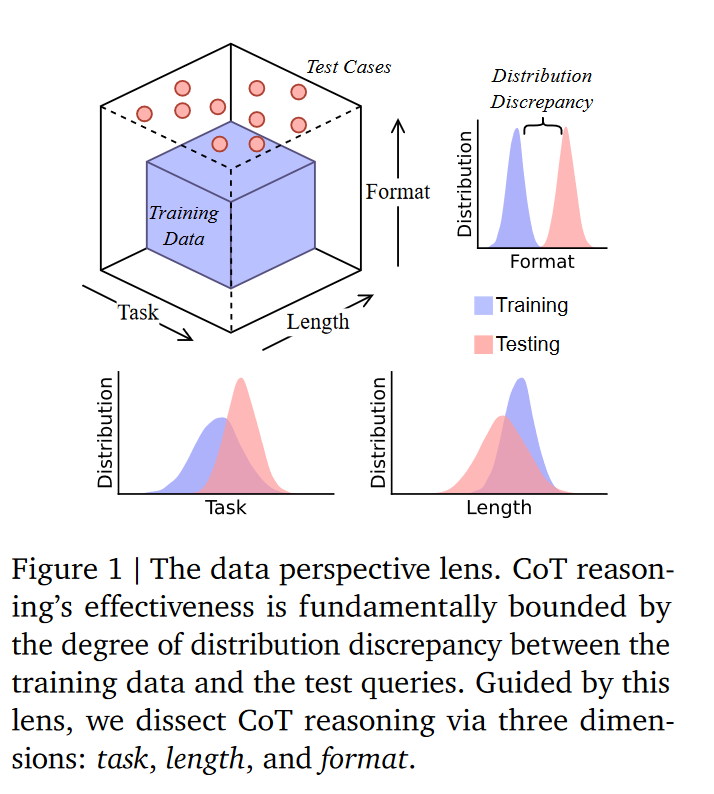 综合上述研究进展可见,当前学界已完成对 CoT 推理 “表面成功” 的验证、“非真推理” 的质疑及 “泛化薄弱” 的认知,但仍存在关键空白:缺乏从数据视角出发的系统性分析框架,未能清晰拆解 CoT 推理在 “任务类型、推理长度、问题格式” 等维度的失效规律。