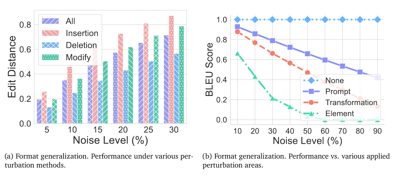 模型对格式变化很敏感,其中 “插入噪声” 影响最大(加乱码最易让模型出错),“删除内容” 影响最小(少个词影响不大);