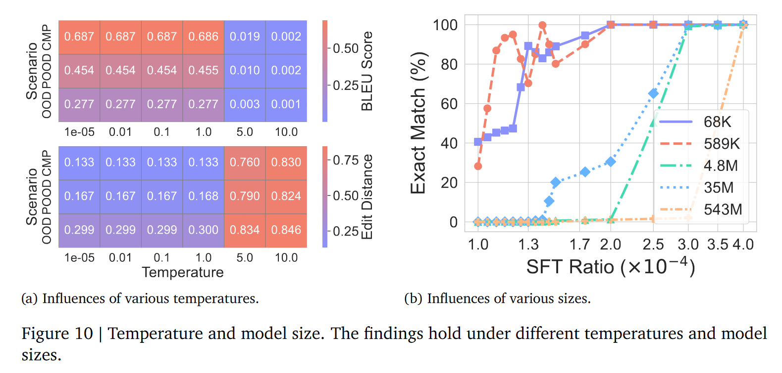 温度与模型规模影响小:在合理温度范围(1e-5~1)内,CoT稳定性不受温度影响;不同规模模型(从68K参到543M参)性能差异小,无需依赖超大模型;