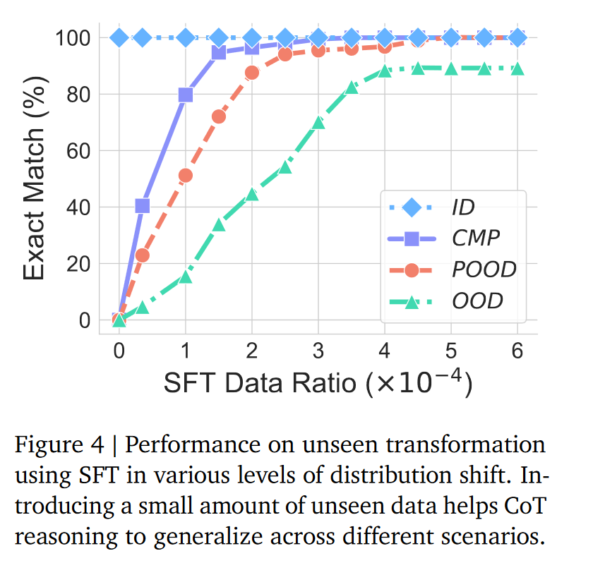 早期研究曾显示 CoT 能实现一定程度的 OOD 泛化,例如在多步骤推理任务中适配超出训练长度的推理链(Shen et al., 2025;Yao et al., 2025),但后续研究揭示了其泛化能力的局限性: