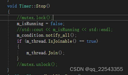 任务函数Loop()中会使用 lock(m_mutex),lock会尝试m_mutex.lock(),但是,第一张图内,m_mutex是上锁状态,lock会停在这里,等待m_mutex.unlock后,再次尝试m_mutex.lock(),简而言之,lock这里发生了阻塞。Join函数等待Loop()函数退出,而Loop函数等待 Join函数退出后m_mutex.unlock() 然后Loop函数内的lock将m_mutex.lock(),Join函数和Loop()互相等待,产生死锁;
