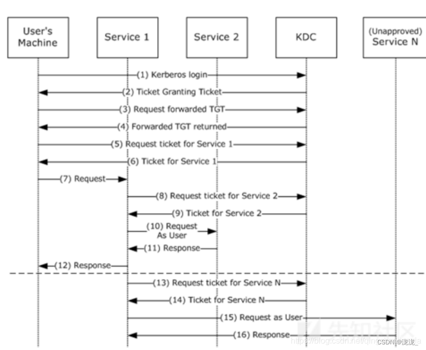 13. 在这个过程中的TGT转发机制,没有限制Service1对TGT2的使用,也就是说Service1可以通过TGT2来请求任意服务。