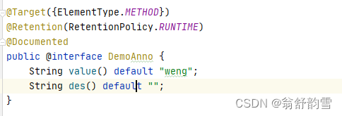 注:可以指定多个位置,例如:@Target({ElementType.METHOD, ElementType.TYPE}),也就是此注解可以在方法和类上面使用
