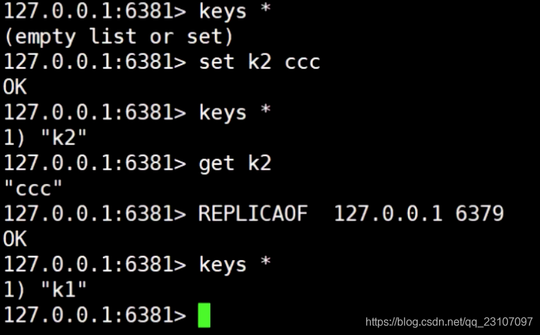 主机器操作完之后,从机器通过手动追随,将6379 的数据同步过来;