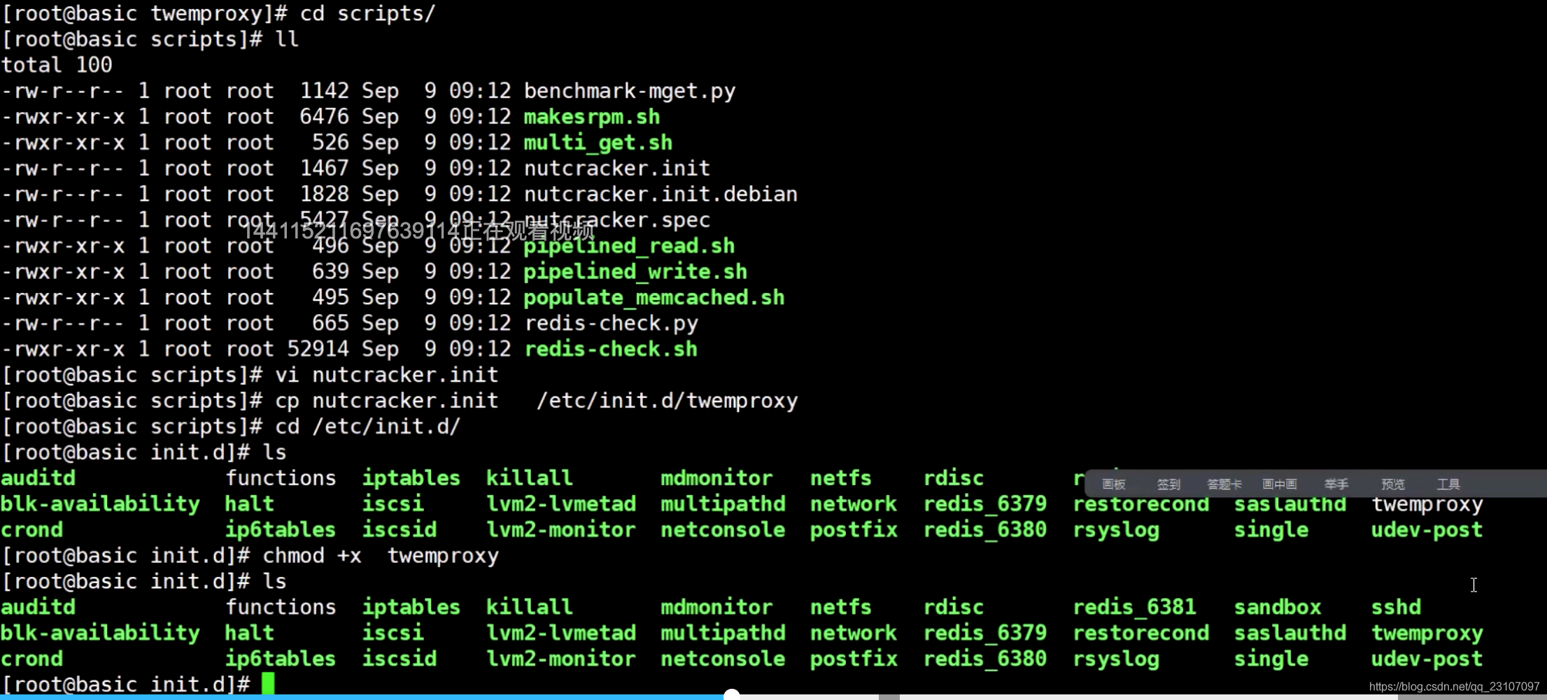 假如,要把服务的实例程序放在/etc/init.d/twemproxy 文件夹中(/etc/init.d 里是service XXX start 启动的可执行程序的文件夹),则有下边的操作;chmod +x的意思就是给执行权限;目标是为了执行 service twemproxy 的时候可以启动之前编译过的代理程序;