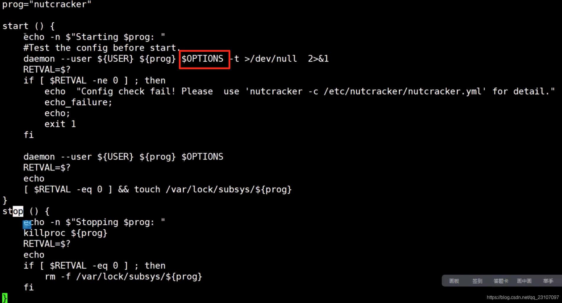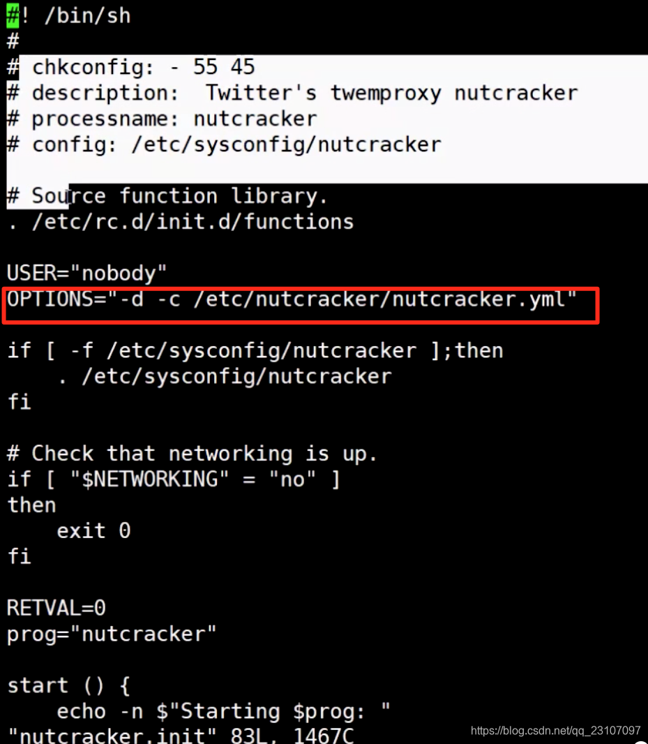 回到clone的源文件 cd twemproxy/scripts/ 查看 nutcracker.init 即 vi nut cracker.init ;这个是服务启动的脚本文件;进入可以看到,如果作为服务执行下边start 函数的时候的时候,需要一个配置文件,位置在OPTIONS 这个变量里面;另外 prog = nutcracker 这句,表示,需要有一个可执行的程序,就是源码编译完之后生成的那个可执行程序;后边要拷贝到相应的位置;
