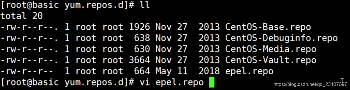 到yum 仓库文件中,可以看到现有的配置文件中默认仓库,执行完以上命令之后,再看yum.repos.d 会发现多了epel.repo仓库;vi rpel.repo 查看,可以看到新的源库位置配置进去了;