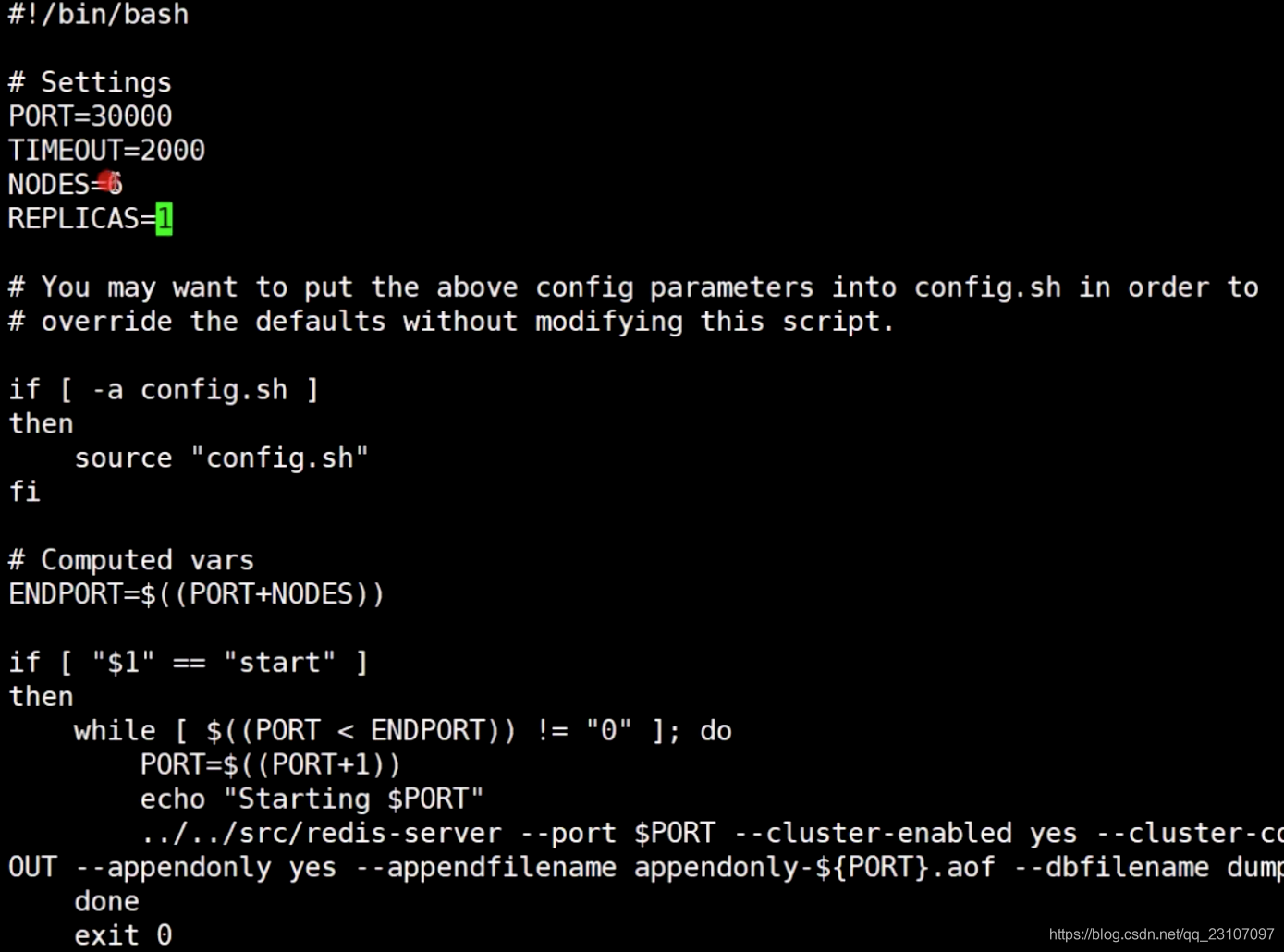 vi create-cluster 更改nodes和 REPLICAS;看到nodes = 6 表示有6个实例节点;REPLICAS =1 代表一组主从中从的数目;那么有几套,就是 nodes/(1+REPLICAS) ,这里就是 6/2 = 3 ,3套主从;