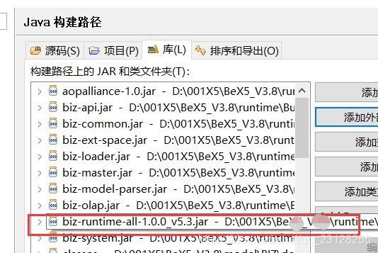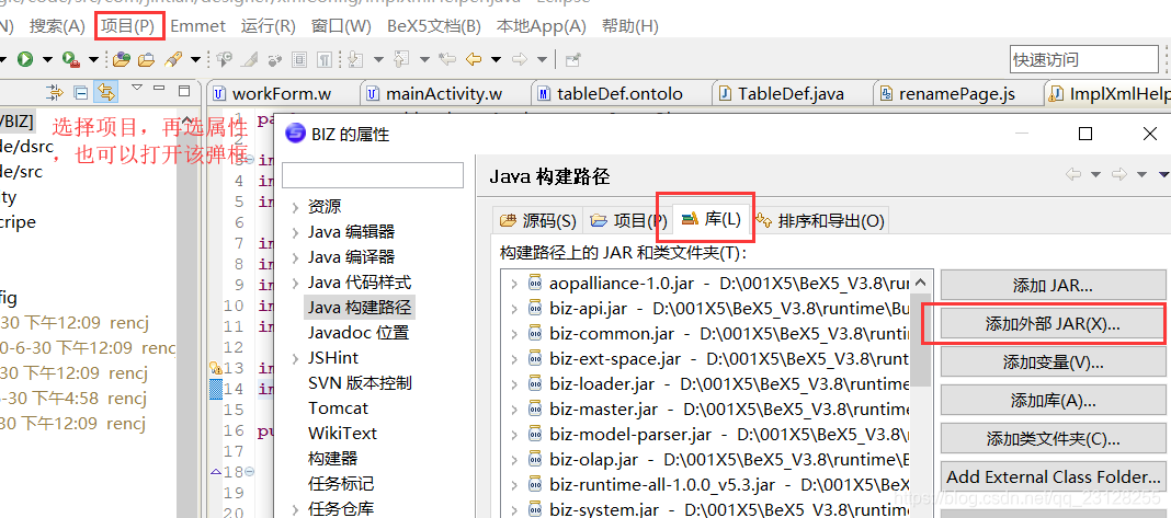 图三:打开要用此jar包的项目,右键该项目,选择属性--》java构建路径(java build path)--》添加外部jar,再按照图二的路径,找到jar文件(也可以直接用找到的目标jar包所在地址),点确定后,jar包就被添加成功了。