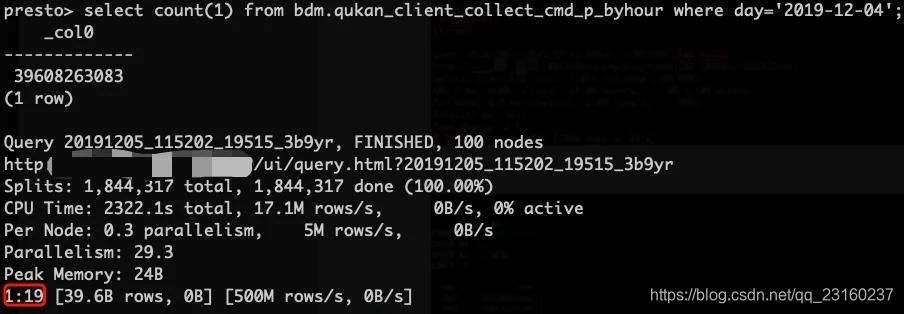 从上图可以看到clickhouse在count一个1100亿数据表只需要2s不到的时间, 由于数据冗余存储的关系,clickhouse实际响应该次查询的机器数只有30台(60 / 2),presto在count一个400亿的数据表耗时80秒左右的时候,100台机器同时在处理这个count的查询。