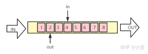 kfifo使用了in和out两个变量分别作为入队和出队的索引: