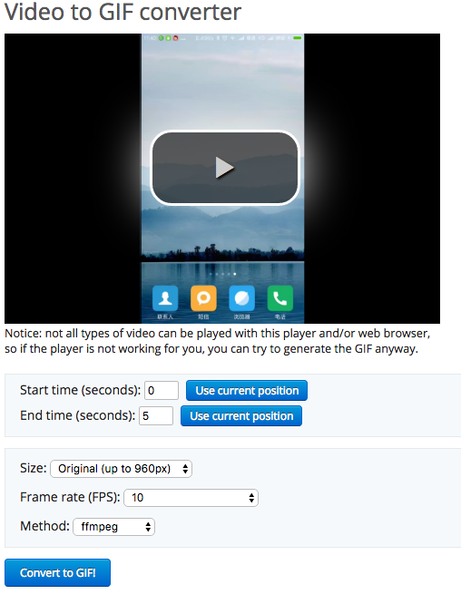 通过上面的creenrecord录制命令,我们得到了屏幕操作视频文件:test1.mp4,而我们下一步的操作就是将MP4文件转化为GIF文件。由于使用的是mac电脑,尝试了几个视频转化gif的软件感觉都不太好,最后发现了一个比较不错的视频转gif的网站:ezgif,可以看一下其主要功能:
