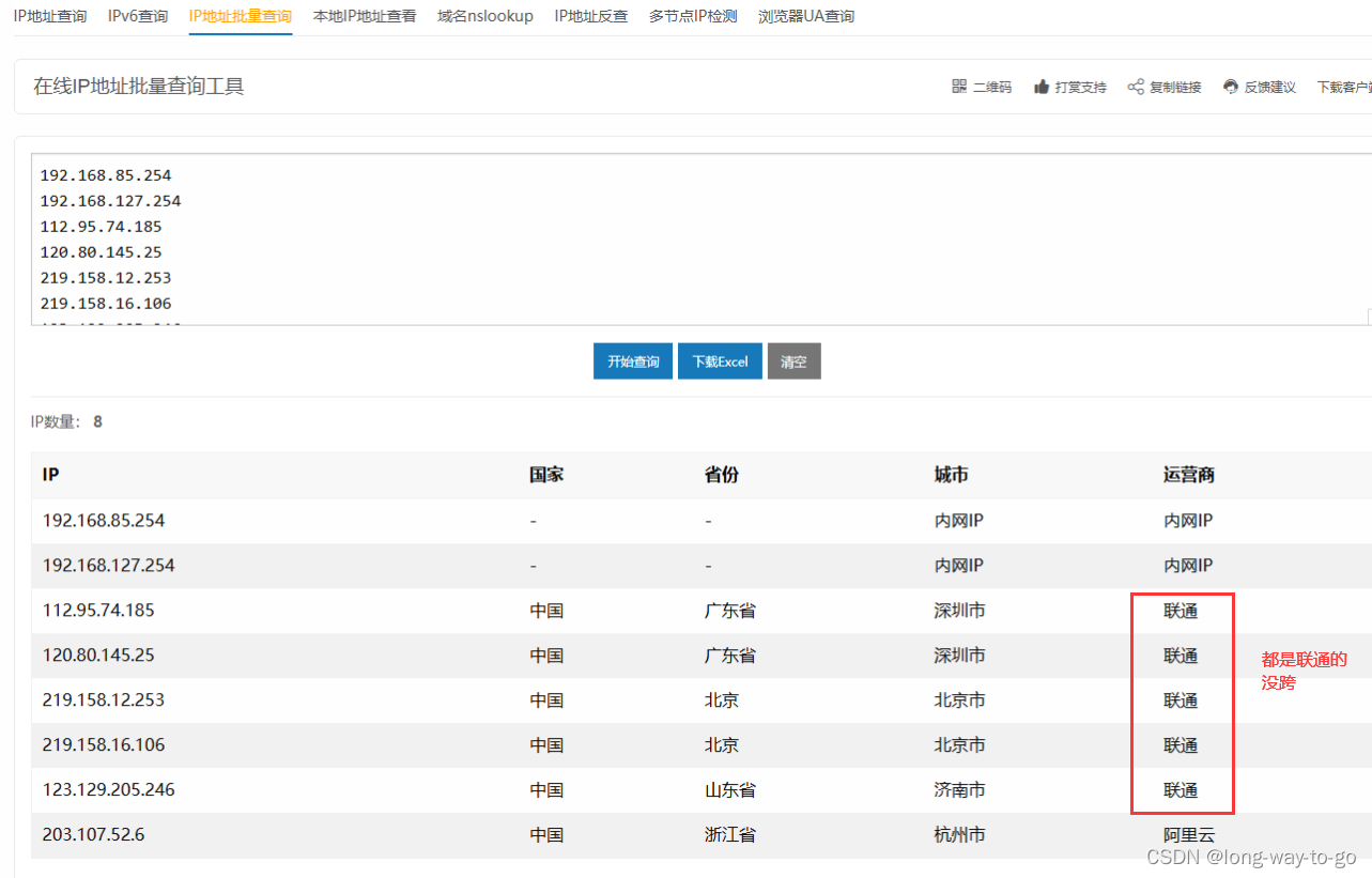 https://uutool.cn/ip-batch/,把步骤1复制的路由ip复制黏贴进去,查看是否出现跨运营商的情况。